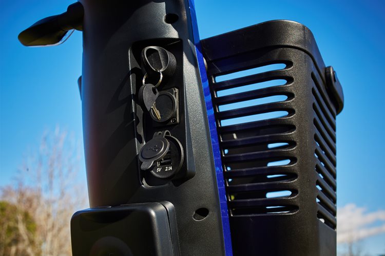 En la columna de dirección tiene una doble toma USB para cargar cualquier dispositivo móvil, una toma de carga del scooter para no tener que agacharse cuando necesite cargar las baterías y un porta-latas para que puedas ir tomando tu bebida favorita mientras paseas.